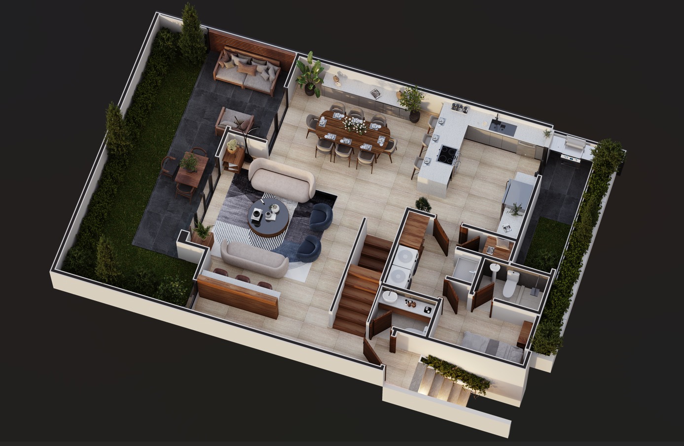 3 dormitorios, 4 baños, sala, comedor, cocina, jardín con área exterior con pérgola, sala familiar, Despensa, lavandería y cuarto de servicio con baño completo. Estacionamiento techado para 4 vehículos.