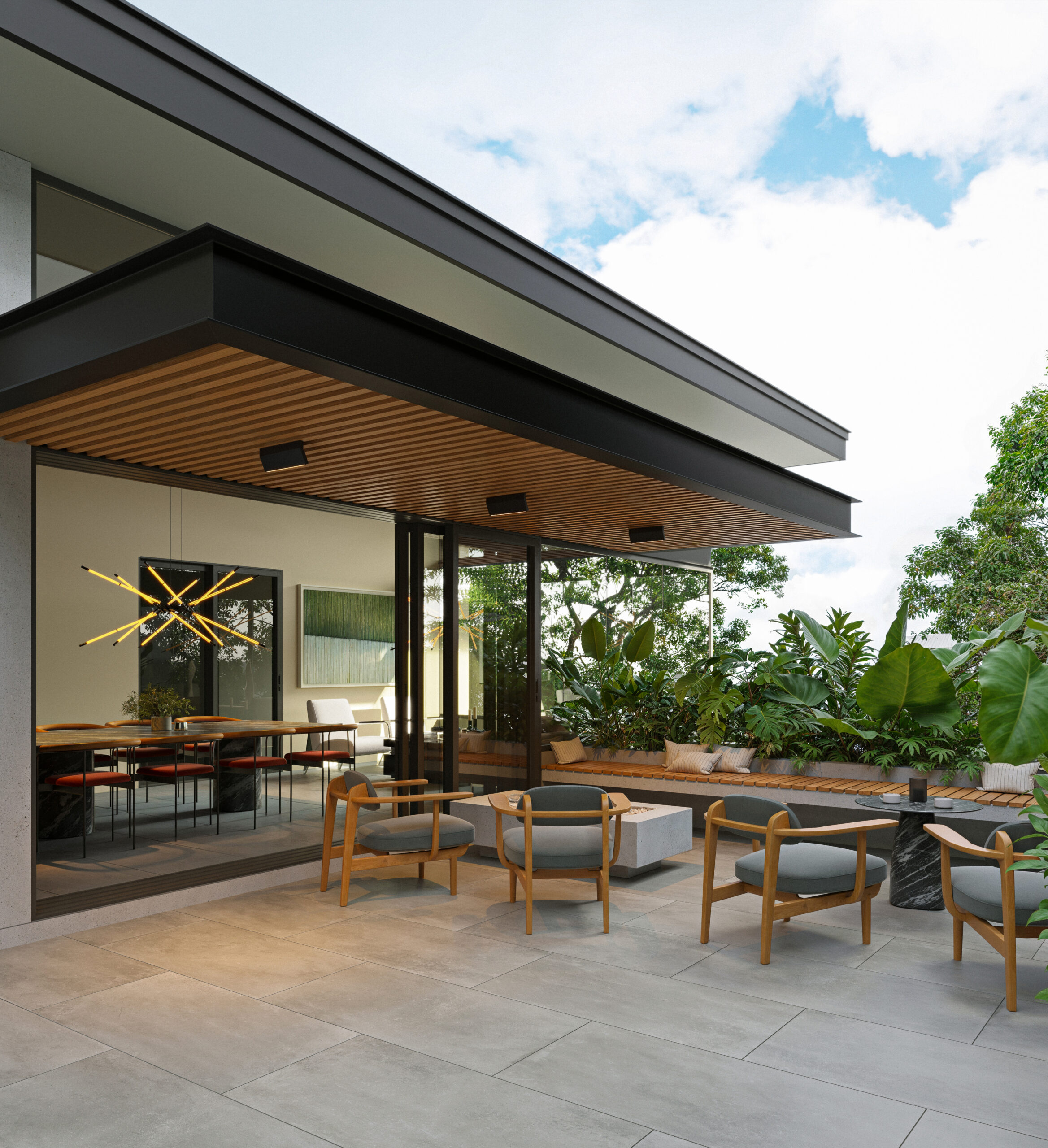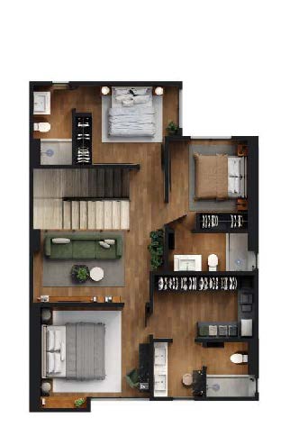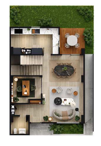 3 dormitorios, 4.5 baños, sala, cocina, comedor, jardín con área al exterior de estar, sala familiar, pasillo de servicio, lavandería, cuarto de servicio con baño completo, bodega, área de equipos y 3 estacionamientos individuales techados.