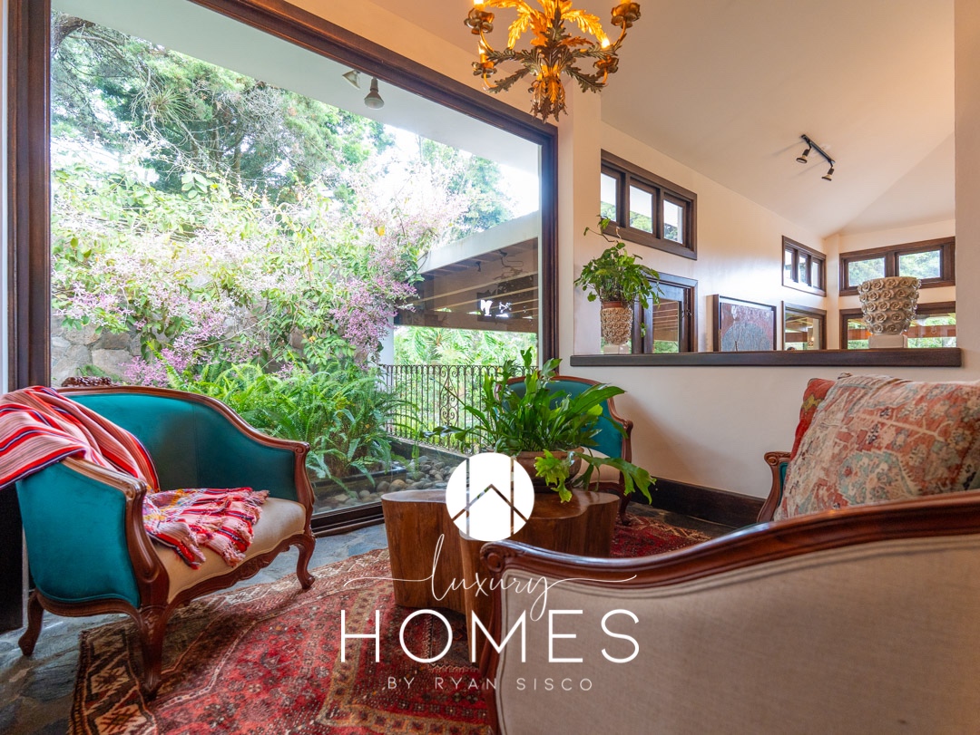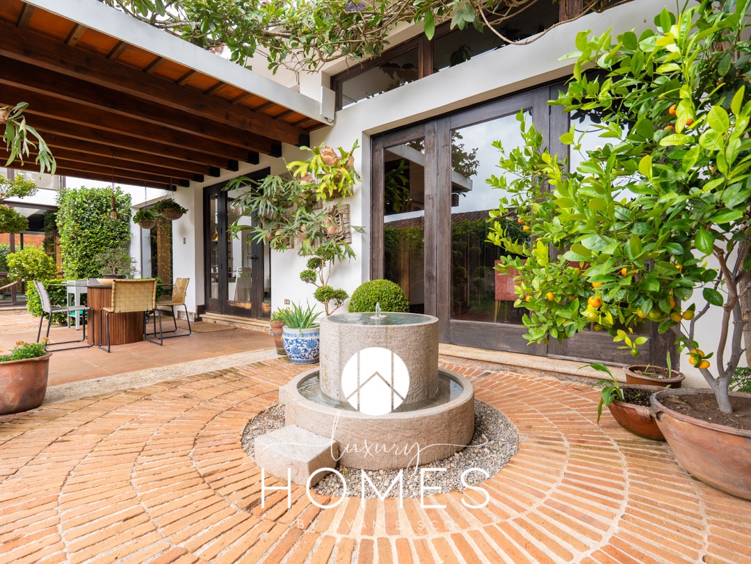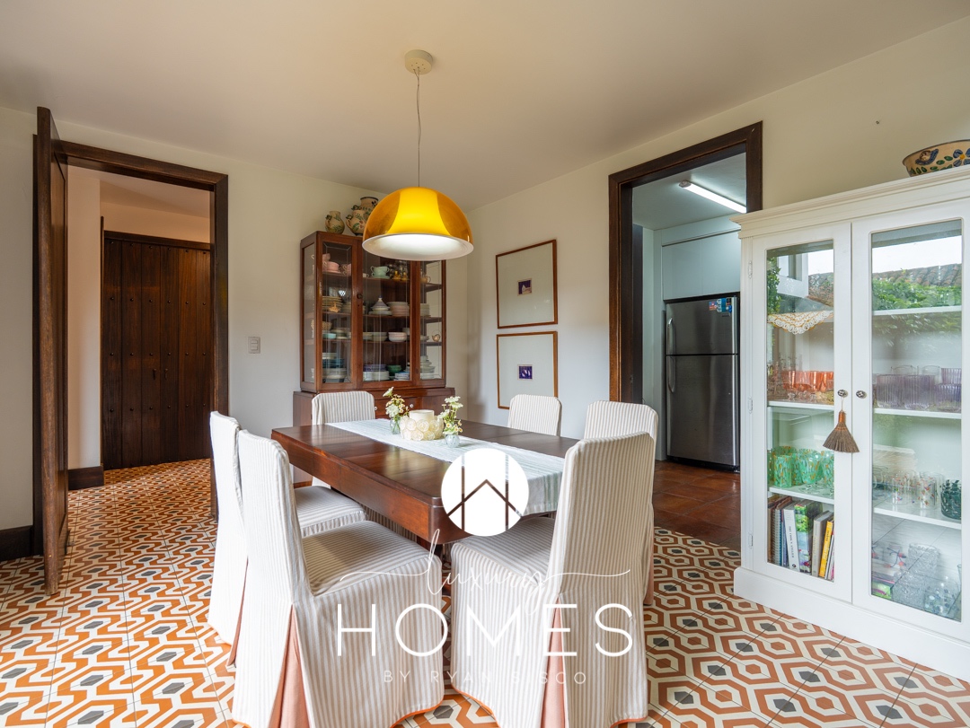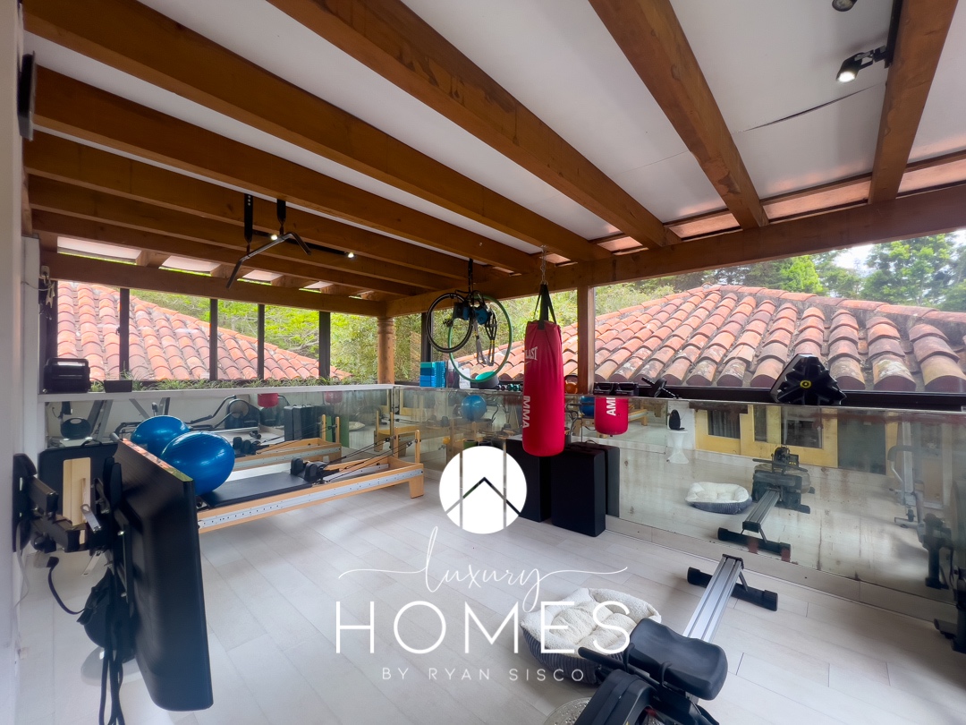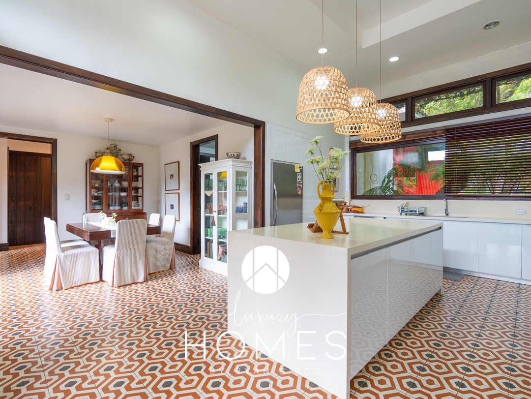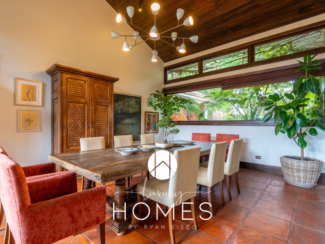 4 dormitorios, 5.5 baños, antesala, sala con chimenea, comedor, cocina, pantry, sala familiar tipo loft, estudio, área para gimnasio, 2 pérgolas, fuente y amplio jardín. Lavandería, cuarto de servicio con baño, cuarto de guardianía y 2 bodegas. Estacionamiento techado para 4 vehículos y 4 más sin techar.