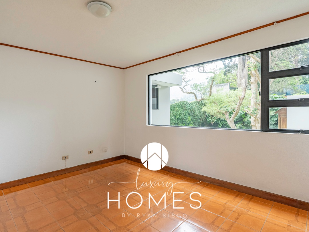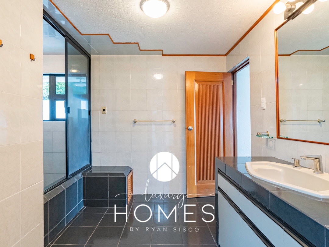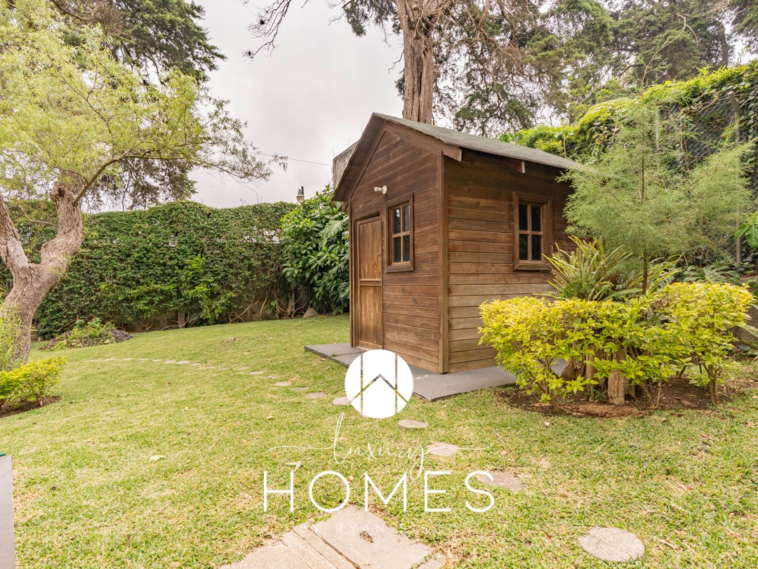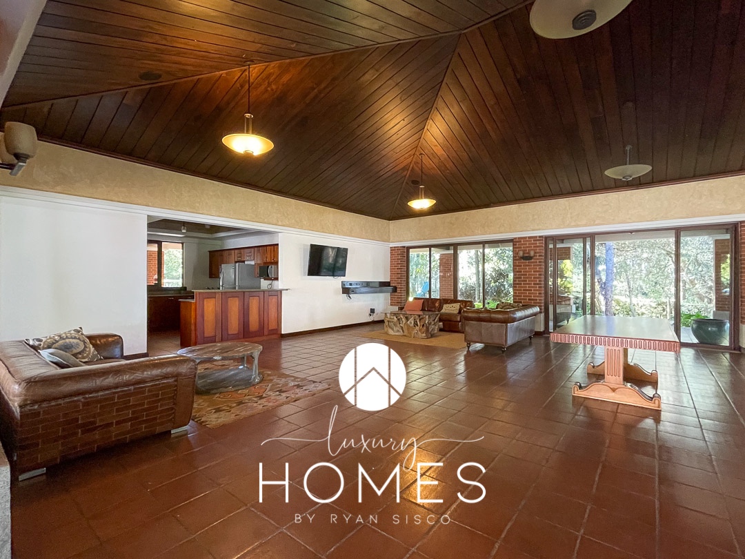 4 dormitorios, 2 baños completos, 2 medios baños, sala con chimenea, comedor, cocina, desayunador, lavandería, cuarto de servicio, jardín amplio con área para juegos, salón para juegos y estacionamiento techado para 3 vehículos, espacio para 8 vehículos más.