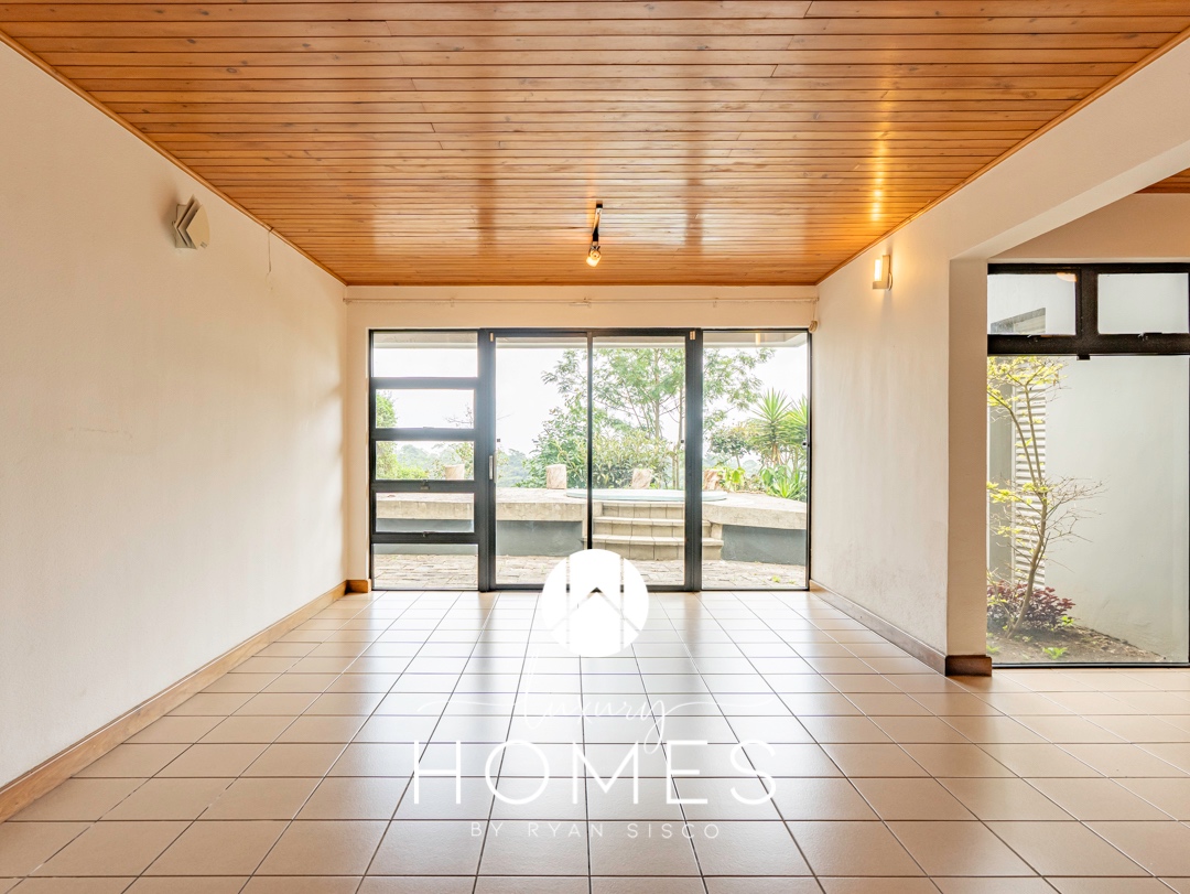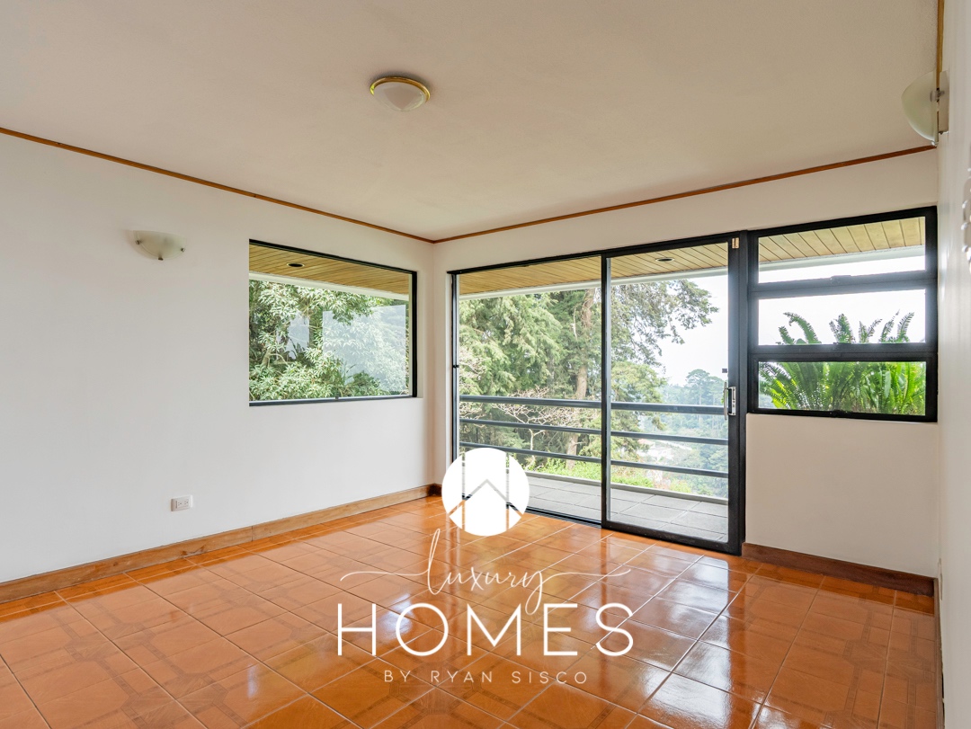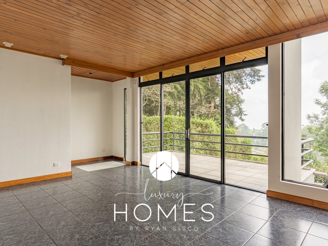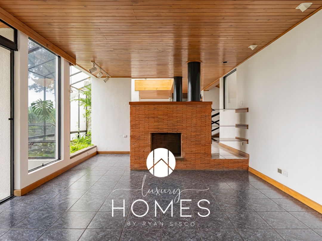 - Sala con chimenea y salida a terraza con linda vista a los volcanes