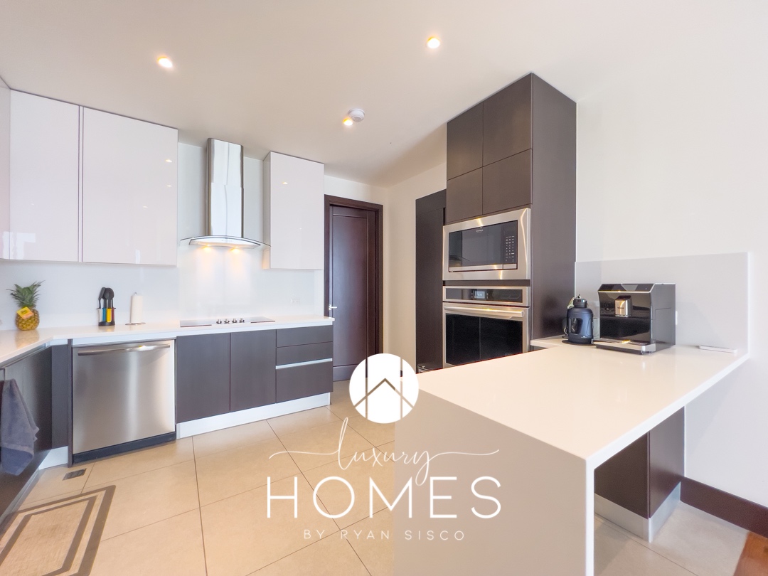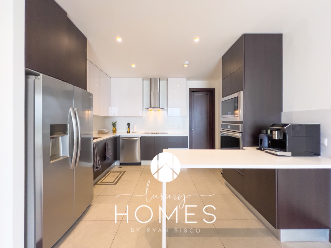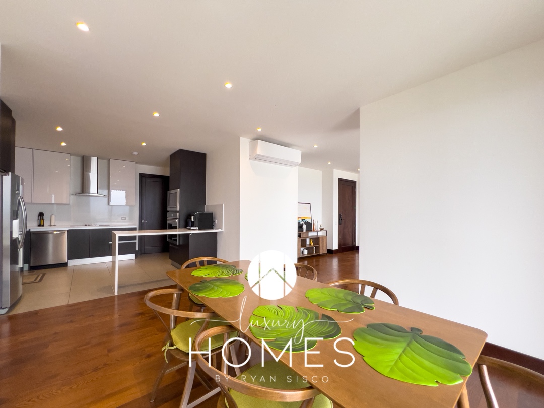 2 dormitorios, 2.5 baños, sala-comedor, cocina, terraza, balcón, lavandería, cuarto de servicio con baño completo, bodega y 2 estacionamientos.