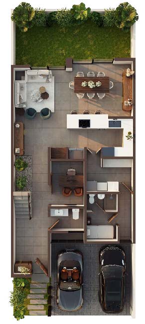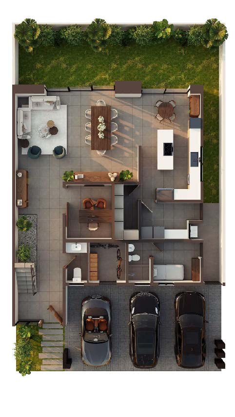 Sala, comedor, baño de visitas, estudio, cocina con pantry, despensa, habitación de servicio, lavandería, bodega y 3 estacionamientos.